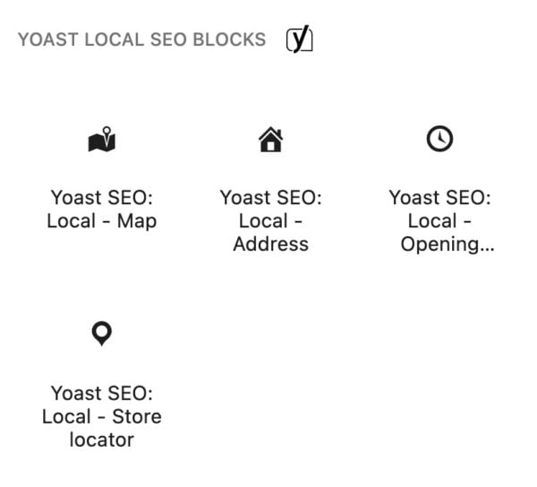 With the block editor, you can add Yoast Local SEO blocks by clicking on the + plus sign and searching for the individual blocks or scrolling down to the Yoast Local SEO blocks. You can find the following blocks: Map, Address, Opening Hours, and Store locator. These blocks are also available as shortcodes or buttons.