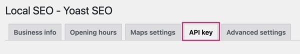 The Local SEO settings consist of five tabs: Business info, Opening hours, Maps settings, API key, and Advanced settings. We’ll discuss these tabs below.