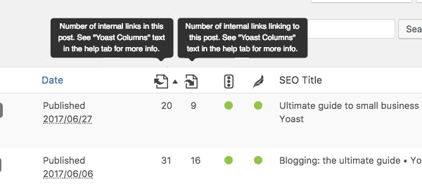 The text link counter, located in the Posts overview screen, counts the number of links in your posts and the number of links to your posts. Using it gives you more control over the links in your texts. Why is this important? Because internal links are essential for findability and creating an awesome site structure.