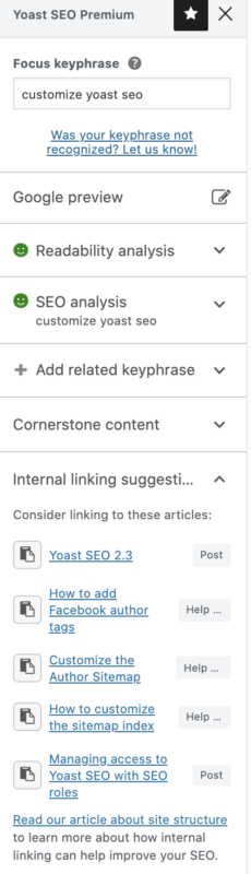 If you have a large site, keeping track of the articles you have can be challenging. It is even more difficult to have a clear idea of how your posts and pages are related to each other. Yoast SEO Premium makes things a little easier with the link suggestions tool located in the Yoast SEO Premium sidebar. The tool produces a list of articles related to the one you are working on. By linking related content, you create a solid site structure that can significantly benefit your SEO.