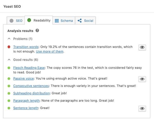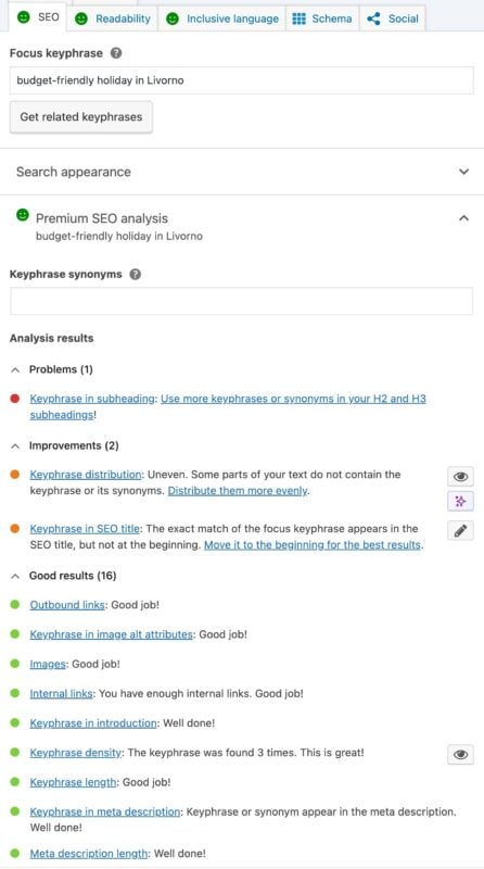 Our SEO analysis is one of the most praised features of Yoast SEO. When it’s activated, the plugin analyses various crucial SEO aspects of your text. For example, it looks at how you use your keyphrase, whether you have enough internal and outbound links, and much more! Given the usefulness of the feature and the wonders it can do, we strongly recommend you use it!