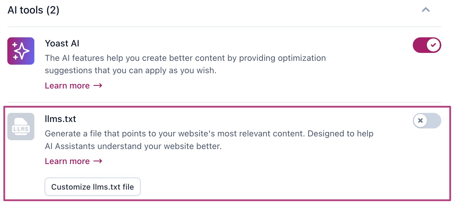 If you’re unable to find, enable or customize llms.txt, please check that you’ve updated to the latest version of Yoast SEO. In addition, check that you have the correct rights for your site. Please note that llms.txt is not available for multisite.