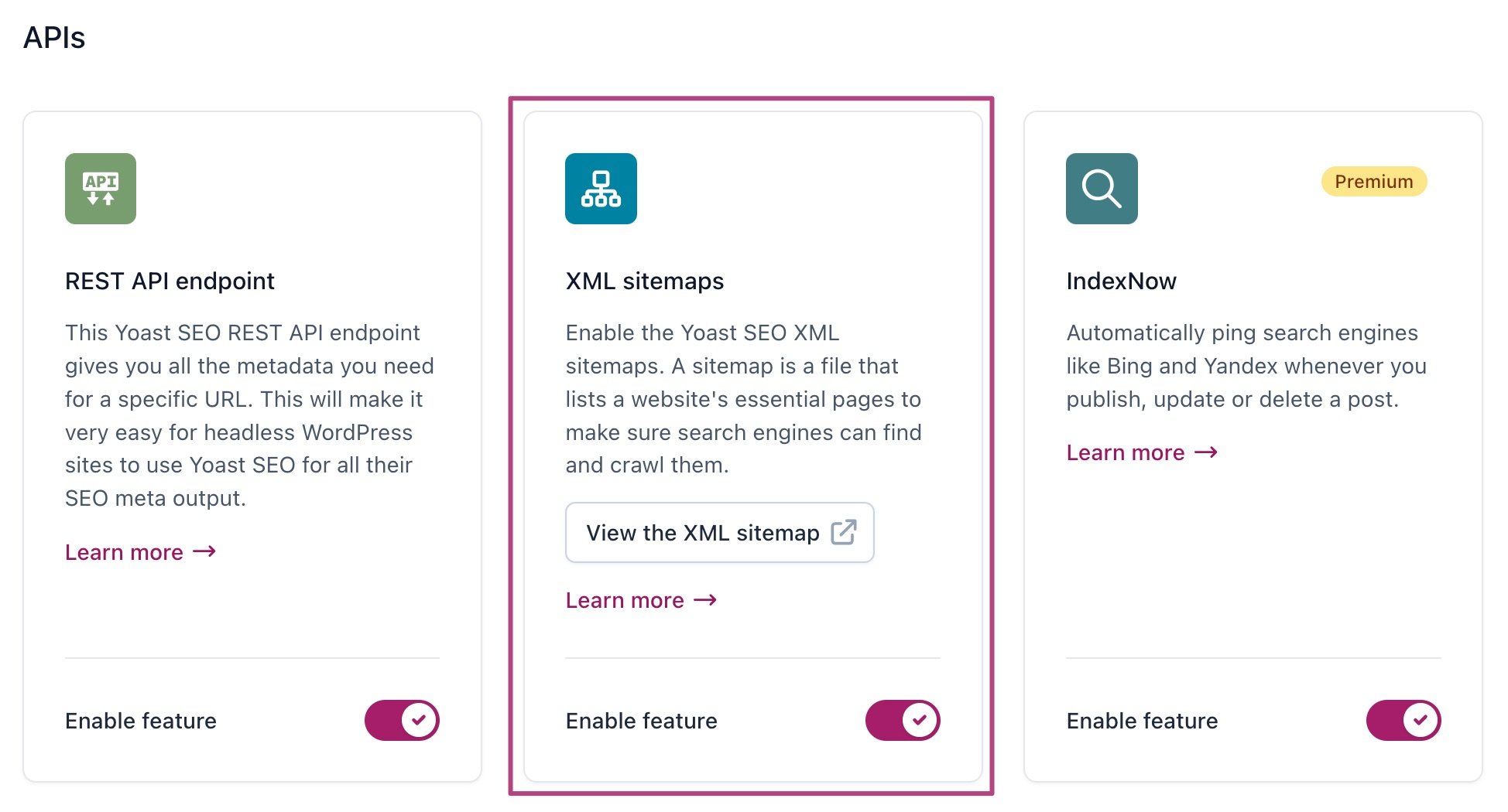 3. In Site features, under APIs, toggle the XML sitemaps switch to On