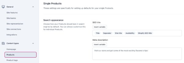 Under Content types, confirm that you’re happy with the variables chosen for the SEO title and meta description. These variables determine your content’s appearance in search results. If you leave these fields empty, our app will rely on data entered through Shopify.