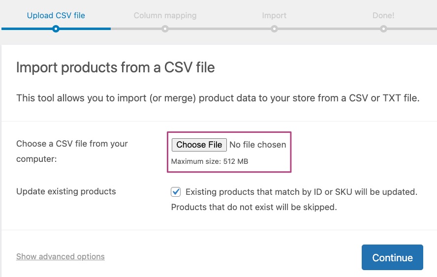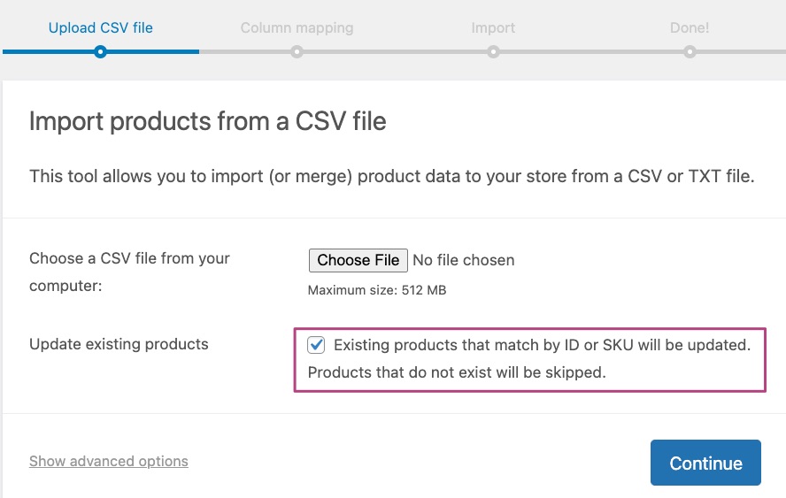 - If you’re updating existing products, tick the box Existing products that match by ID or SKU will be updated.