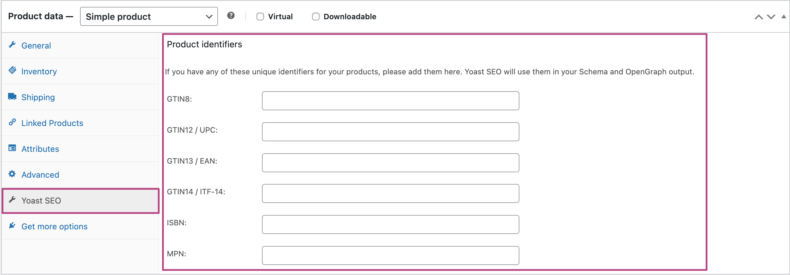If you want to add global identifier for individual products, go to the product editor and click on the Yoast SEO tab of the WooCommerce meta box. There, you will see the options to add product identifiers. Add the product identifiers that your products contain in the appropriate boxes.