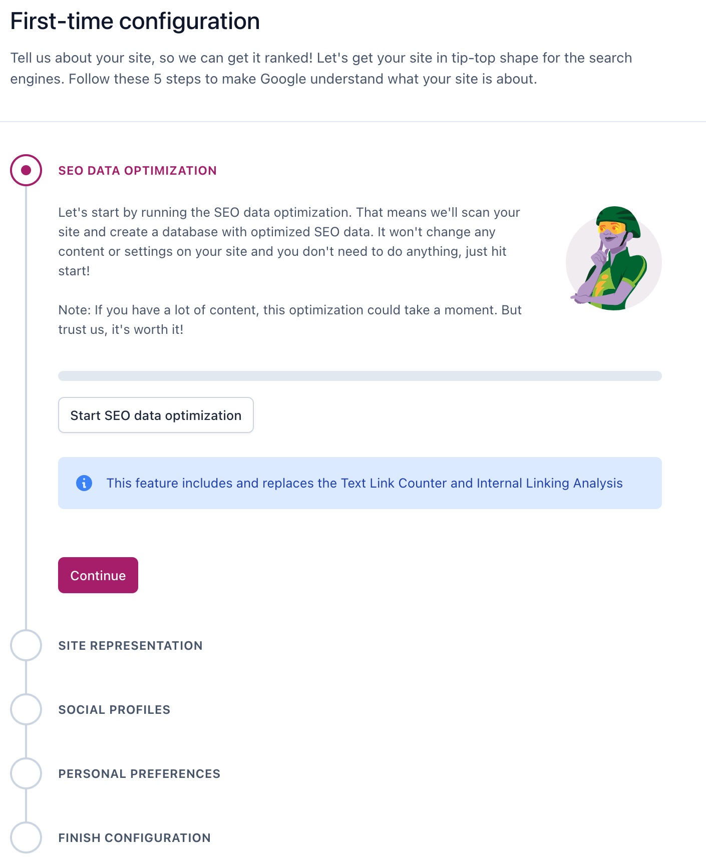 To make sure that Yoast SEO works correctly, run the First-time configuration in the Yoast SEO menu. You can also go here directly by clicking the link in Step 4 of the Import from other SEO plugins process.