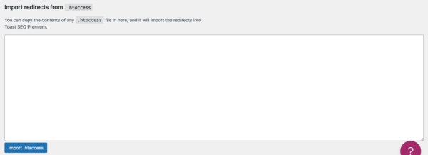 Yoast SEO Premium allows you to import from supported redirect plugins, from a CSV file, or from a .htaccess file.