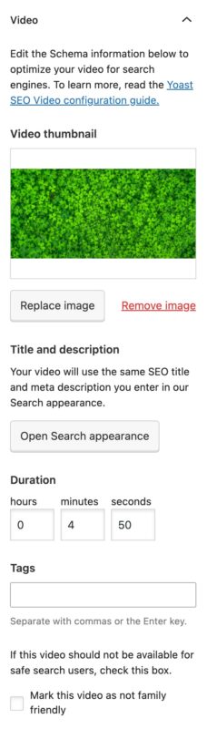 Once you’ve set up the the plugin, open a post and embed a video from one of the supported platforms. When you save or publish the post, you can access the Video tab in the Yoast SEO sidebar or metabox.