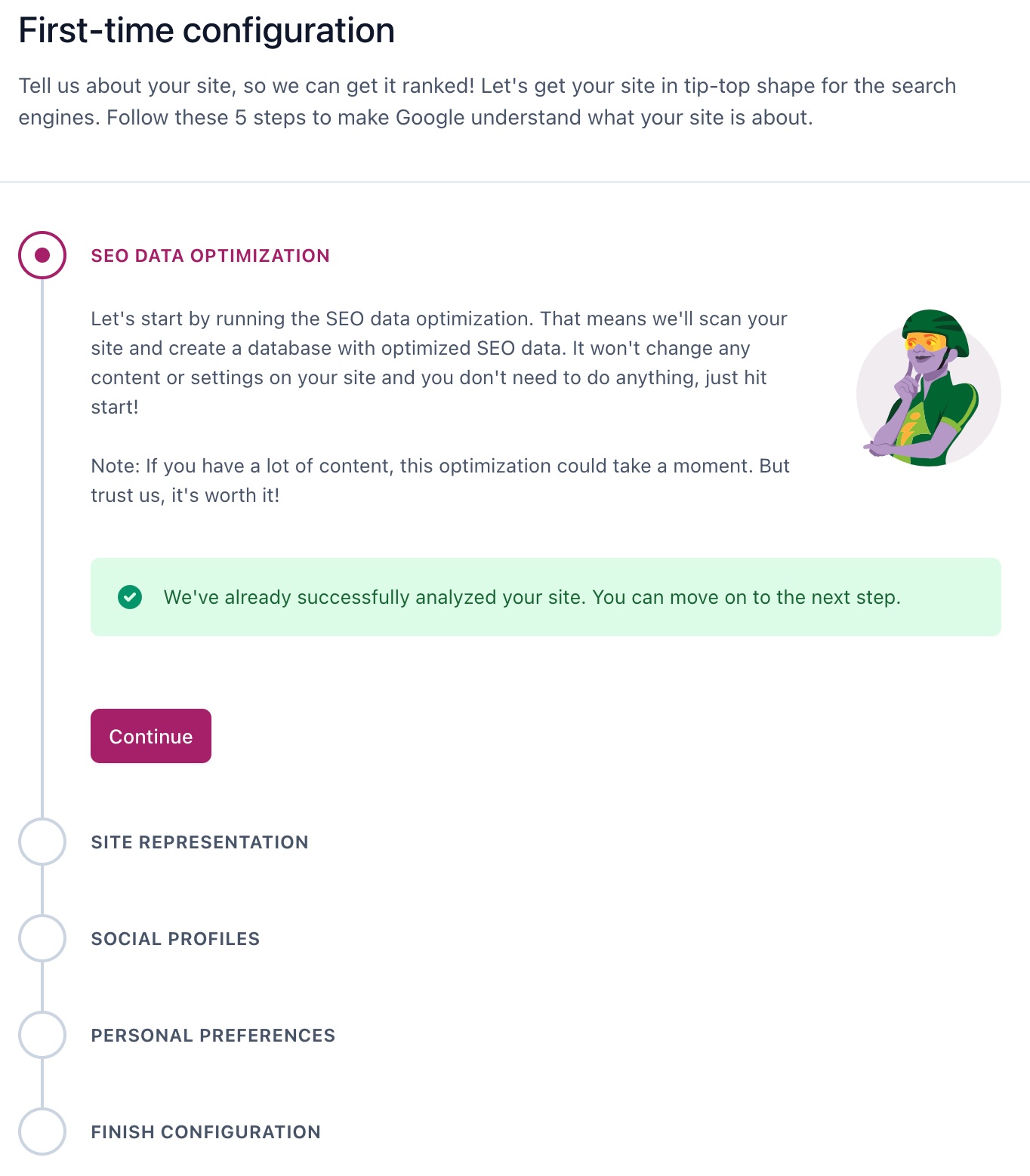 The configuration will walk you through the essential settings, such as the SEO data optimization, your site’s representation, and your social media profiles.