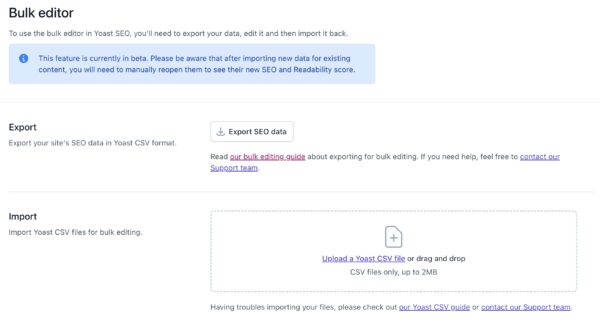 The bulk editor allows you to update titles, meta descriptions, focus keyphrases, and more across multiple pages using a CSV file. This feature is currently in beta.
