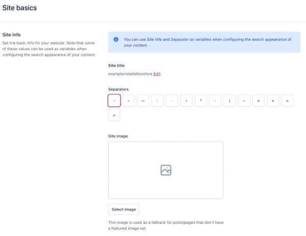 The Site title and Separator: this sets default template for the SEO title of your site, which appears in search results. It acts as a backup if you don’t fill in an SEO title for individual pages.