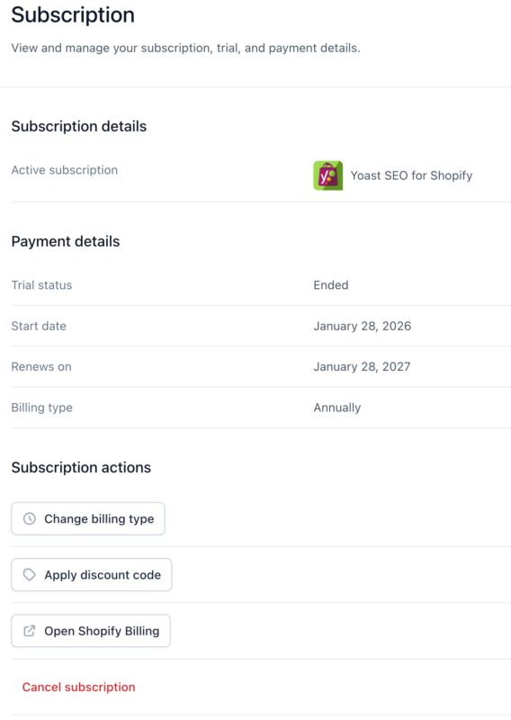 Under Cancel subscription, you can end and cancel your Yoast SEO for Shopify subscription. Please note that canceling the subscription is a two-step process: follow the instructions in our guide on How to uninstall Yoast SEO for Shopify.