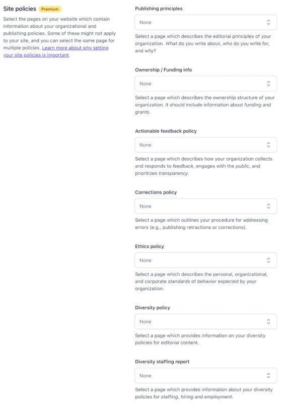 If you have Yoast SEO Premium, you can also enable Site policies. Here, you can explicitly identify your policy pages, such as publishing principles, ethics or diversity policies. By using the Site policies settings, you’re sending a clear message to search engines that you take your role as a reliable source of information seriously.